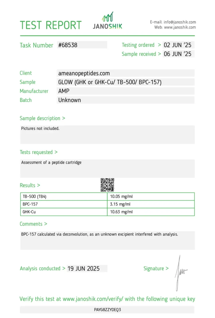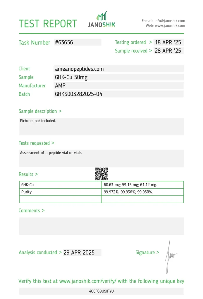 Every peptide is produced in a stringent quality-controlled laboratory and undergoes independent third-party testing to ensure ≥ 99 % purity and consistency in every batch.
